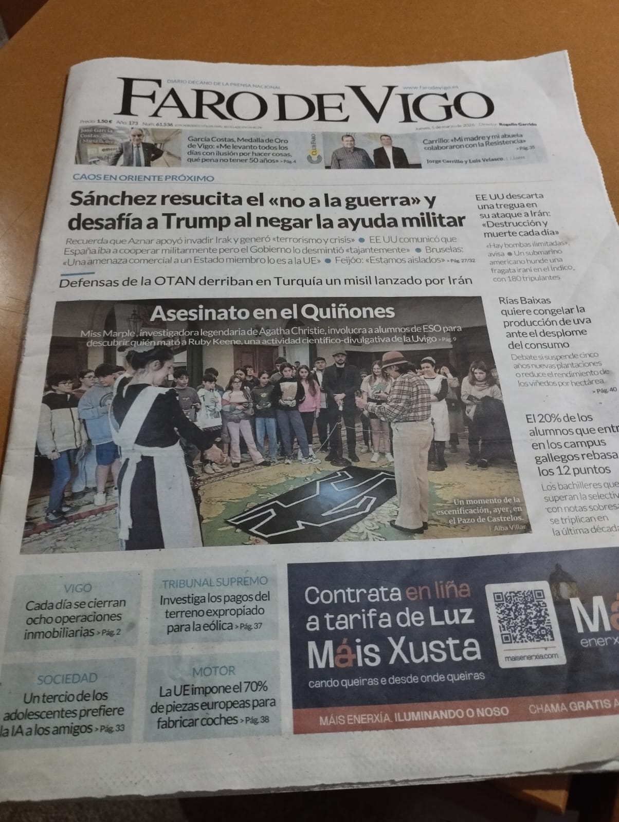 Los pasados 4 y 5 de marzo de 2026, en el museo municipal Quiñones de León de Vigo, la Universidade de Vigo organizó la actividad teatral Misterio no pazo, un teatro divulgativo e inmersivo que rindió homenaje a la escritora Agatha Christie en el año en el que se cumplieron 50 años de su fallecimiento y coincidiendo con la celebración del Día Mundial del Teatro. Varios investigadores (entre ellos miembros de ANILIJ), técnicas de la UCC+i y de la Oficina de Proyectos Internacionales (OPI) colaboraron en el desarrollo del evento.